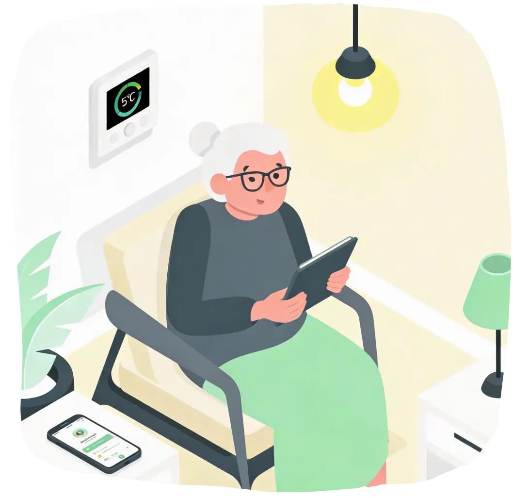 Onze slimme technologie werkt voor iedereen: bewoners genieten van persoonlijke comfort en veiligheid, zorgverleners ontvangen proactieve welzijnssignalen, en onze beheerders gebruiken het voor energie en onderhoud. Moderne innovatie die zorgt voor een hogere kwaliteit van leven